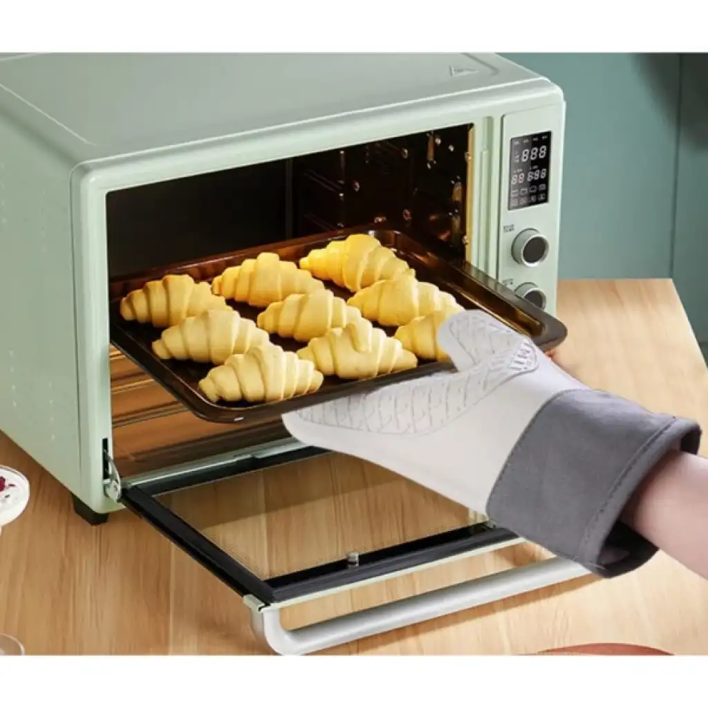 ISIYA DAYANIKLI SİLİKON FIRIN ELDİVENİÜrün ÖzellikleriIsıya dayanıklı silikon fırın eldiveni, mutfakta fırın, ocak veya ızgara gibi yüksek sıcaklıklara maruz kalınan alanlarda ellerinizi korur. Kaymaz silikon dış yüzeyi, tencere, tepsi gibi kaygan yüzeyleri güvenle tutmanızı sağlar. Eldivenin aramid fiber malzemesi, ekstra ısıya dayanıklılık sağlar ve yanmaz özelliklidir. Yumuşak pamuk iç astar, kullanım sırasında konforlu ve yumuşak bir his sunar. Eldiven, 250°C (482°F) ve üzerindeki sıcaklıklara kadar koruma sağlar ve hem sağ hem sol elde kullanılabilir. Profesyonel mutfaklarda ve evde güvenle kullanılabilir.Paket İçeriği1 Adet Isıya Dayanıklı Silikon Fırın Eldiveni