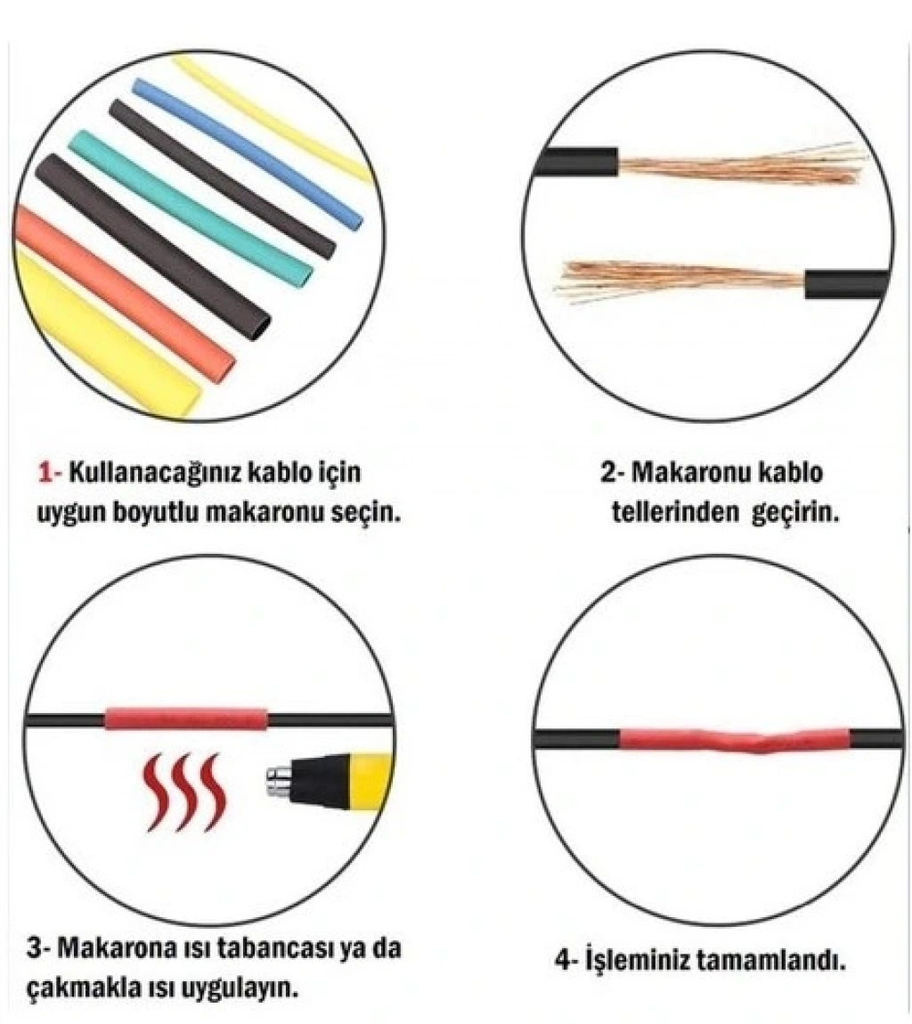 KABLO KORUYUCU MAKARON SETİ 164 PARÇADaralan makaron, ısı etkisi ile belirli bir oranda daralarak çapı küçülen özel bir izolasyon malzemesidir. Elektriksel izolasyon, koruma, etiketleme, sınıflama gibi uygulama alanları vardır. Isı etkisi ile 2 ye 1 oranında küçülerek, operasyona konu olan kabloların etrafını sıkıca sarar. Bu sarma işlemi sayesinde, kapladığı malzemeyi dış etkenlerden korur. Genellikle kabloların yalıtım amaçlı kaplanması işleminde kullanılmaktadır.8 Farklı çapta makaron bu sette bulunmaktadır. Her çap için 4-5 farklı renk seçeneği vardır. Kullanımı uygulanması çok kolaydır. Aşağıda adet çap ve uzunluk tablosu bulunmaktadır.( Adet x Çap x Uzunluk Renk )60 Adet x 1.0mm x 40mm (Sarı, Siyah, Kırmızı, Yeşil )30 Adet x 2.0 mm x 40mm (Sarı, Siyah, Kırmızı, Mavi )16 Adet x 3.0mm x 40mm (Sarı, Siyah, Kırmızı, Yeşil )16 Adet x 4.0mm x 40mm Sarı, Siyah, Kırmızı, Mavi )14 Adet x 6.0mm x 40mm (Sarı, Siyah, Kırmızı, Yeşil )12 Adet x 8.0mm x 80mm (Sarı, Siyah, Kırmızı, Mavi )8 Adet x 10.0mm x 80mm (Sarı, Siyah, Kırmızı, Yeşil )8 Adet x 14.0mm x 80mm Sarı, Siyah, Kırmızı, Mavi )Paket İçeriği164 parça ısıyla daralan makaron kablo koruyucu set