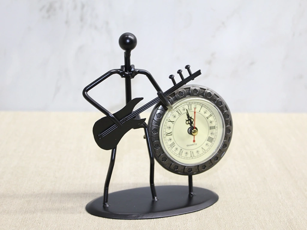 METAL SAATLİ GİTAR ÇALAN MÜZİSYENÜrün ÖzellikleriMetal saatli gitar çalan müzisyen figürü estetik ve modern tasarımıyla dekoratif bir masa saati olarak kullanılabilir. Siyah metal malzemeden üretilen ürün, gitar çalan müzisyen görünümüyle dikkat çekici bir dekoratif obje özelliği taşır. Hem saat işlevi hem de sanatsal tasarımıyla ofis, salon veya çalışma alanlarında şık bir tamamlayıcı aksesuar olur. Dayanıklı yapısı ve zarif görünümü sayesinde hediye alternatifi olarak da tercih edilebilir.Paket İçeriği1 adet Metal Saatli Gitar Çalan Müzisyen