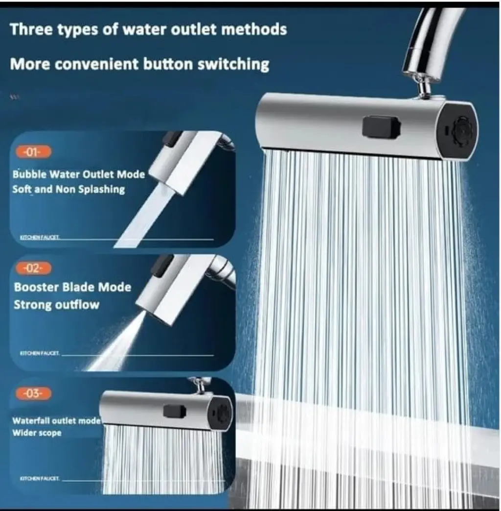 360 Derece Döner Musluk Başlığı - Su Tasarruflu Çok Fonksiyonlu Musluk UcuÜrün Açıklaması:360 Derece Döner Musluk Başlığı ile mutfak ve banyo musluklarınızda su kullanımını optimize edin! Su tasarrufu sağlayan bu çok fonksiyonlu musluk ucu, su akışını iki farklı modda ayarlamanıza olanak tanır: yumuşak köpük akışı ve güçlü sprey modu. 360 derece döner yapısı sayesinde istediğiniz yöne kolayca su yönlendirebilirsiniz. Yüksek kaliteli paslanmaz çelik ve ABS plastik malzemeden üretilmiştir, dayanıklı ve uzun ömürlüdür. Kolay montajı ile her türlü musluğa uyum sağlar ve mutfakta, banyoda veya bahçede kullanım için idealdir. Su tasarrufu yaparken aynı zamanda işlerinizi kolaylaştırın! İçeriği:1 Adet 360 Derece Döner Musluk Başlığı