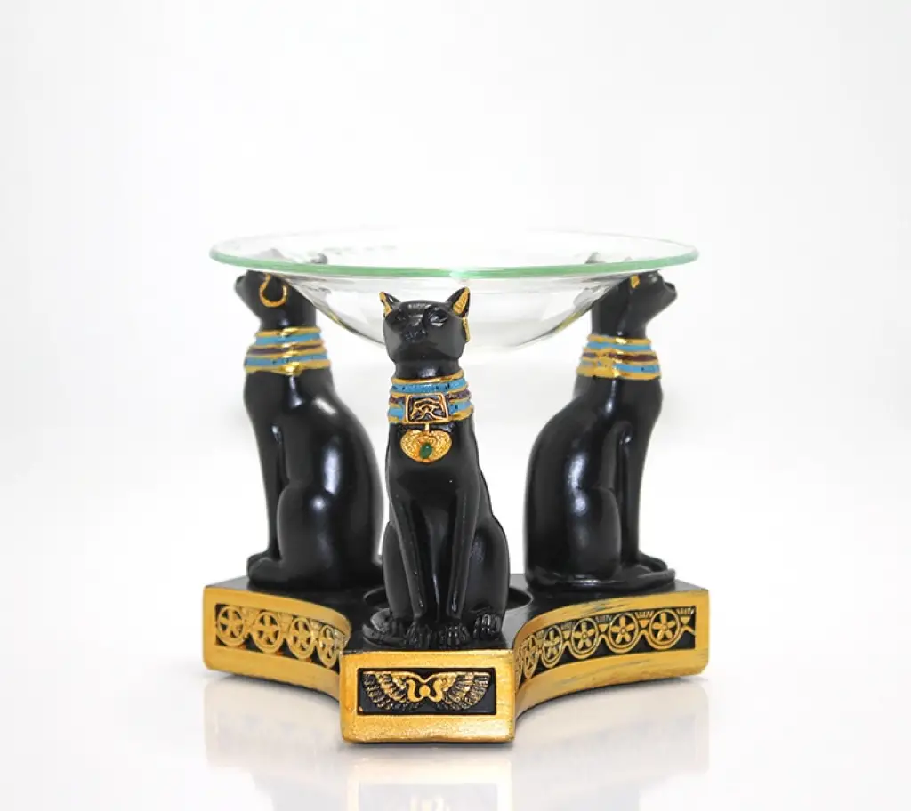 POLYESTER MISIR KEDİSİ BUHURDANLIKPolyester Mısır Kedisi Buhurdanlık, Antik Mısır’ın sembolik kedi figürlerini modern dekorasyonla buluşturan şık bir aromaterapi ürünüdür. 11x12 cm boyutundaki ideal ölçüsü sayesinde hem ev hem de iş yeri ortamlarında kolayca kullanılabilir. Üç detaylı Mısır kedisi figürünün taşıdığı cam hazne, ürüne hem estetik hem de mistik bir görünüm kazandırır. 1.derece kaliteli polyesterden üretilmiş olması sayesinde uzun ömürlü, sağlam ve ısıya dayanıklı bir kullanım sunar. Üst kısımda yer alan cam bölmeye uçucu yağ, esans yağı veya kokulu mum yağı eklenerek ortamda hoş ve kalıcı bir aroma yayılması sağlanır. Alt bölmeye yerleştirilen tealight mum ile birlikte kısa sürede verimli bir aromaterapi etkisi oluşturur. Etnik dekor sevenler, fark yaratan biblo tarzı buhurdanlık arayanlar ve yaşam alanına mistik bir dokunuş katmak isteyenler için ideal bir seçimdir. İçeriği Polyester Mısır Kedisi Buhurdanlık