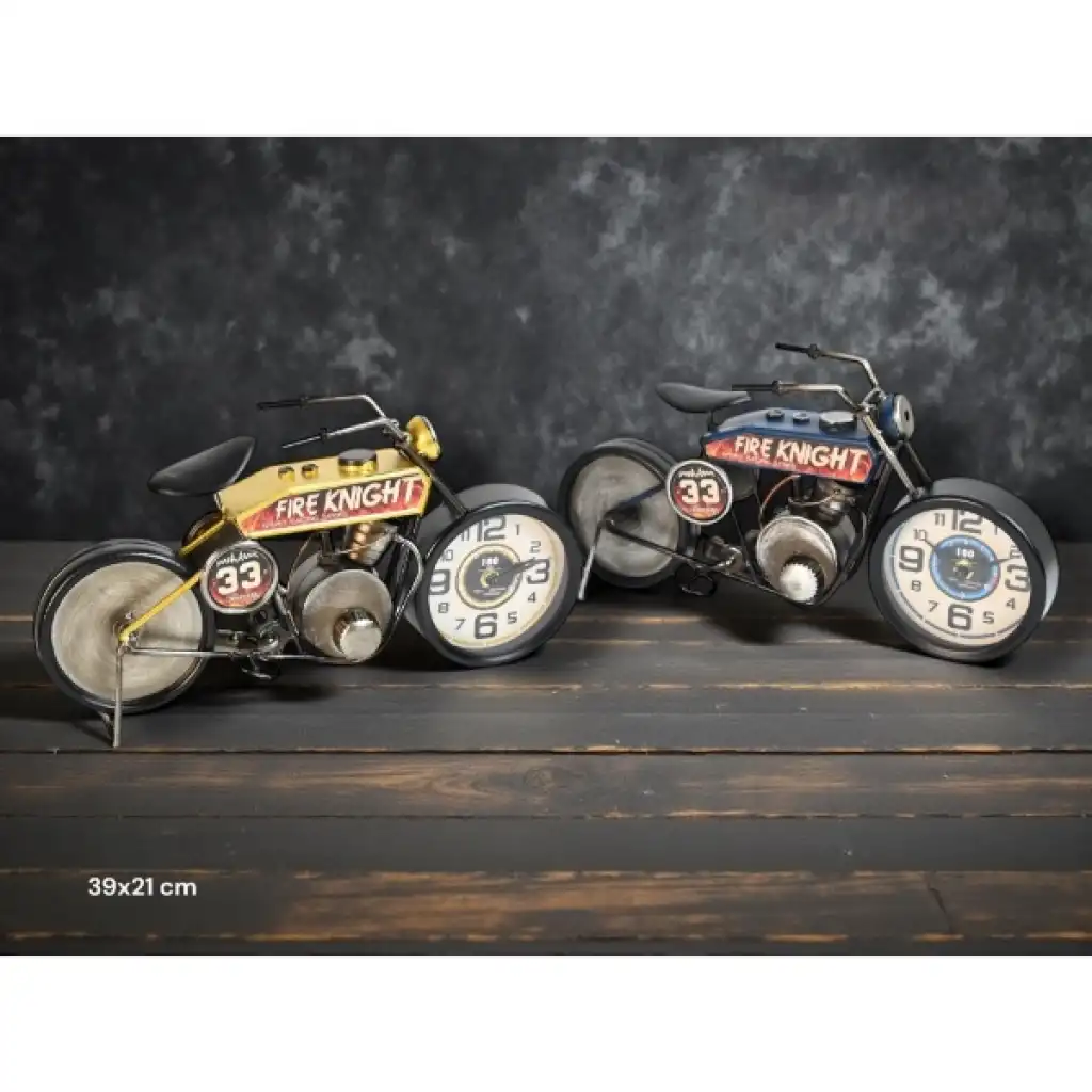 YARIŞ MOTORU TASARIMLI MASAÜSTÜ SAATÜrün ÖzellikleriYarış motoru tasarımlı masaüstü saat, hız ve yarış ruhunu dekoratif bir obje formunda yaşam alanlarına taşıyan özgün bir tasarıma sahiptir. Klasik yarış motosikletlerinden ilham alınarak hazırlanan gövde yapısı, metal görünümlü motor bloğu, geniş jant detayları, egzoz ve sele tasarımıyla gerçekçi ve koleksiyonluk bir görünüm sunar. Ön tekerlek kısmına entegre edilmiş analog saat mekanizması, büyük ve net rakamları sayesinde kolay okunabilirlik sağlarken dekoratif bütünlüğü bozmadan işlevsellik kazandırır. 39x21 cm ölçüsü ile masa, raf, kitaplık, konsol veya vitrin üzerinde rahatlıkla sergilenebilir ve bulunduğu ortamda dikkat çekici bir odak noktası oluşturur. Sessiz çalışan mekanizması sayesinde ofis, çalışma alanı veya ev ortamlarında rahatsız edici bir ses oluşturmaz. Retro, endüstriyel ve motor temalı dekorasyon stilleriyle uyumlu yapısı sayesinde özellikle motor tutkunları ve koleksiyon meraklıları için ideal bir dekoratif üründür. Renk seçimi yapılamamakta olup ürün, görsellerde yer alan yarış motoru modellerinden biri olacak şekilde 3e grup olarak gönderilmektedir. Estetik duruşu, detaylı işçiliği ve tematik tasarımıyla hem dekoratif kullanım hem de hediye alternatifi olarak öne çıkar.Paket İçeriği1 adet yarış motoru tasarımlı masaüstü saat